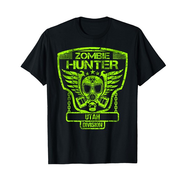 - Zombie Hunter Utah Division apparel. Outfit your entire hunting crew. Toxic green infected zombie lover design with gas mask with biohazard symbol and wings.
