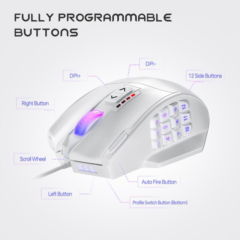 - 『FULLY CUSTOMIZABLE MOUSE & RGB BACKLIT』Venus MMO wired gaming mouse with multiple programmable buttons (included 12 side buttons), 5 custom profiles each with 5 LED RGB colors backlit modes for quick identification of profiles and additional options for over 16 million LED RGB colors. The LED breathing light can be disabled according to your preference. Special Setting Switch Button on the bottom of the wired gaming mouse allows you to execute the switch profile command with maximum efficiency.