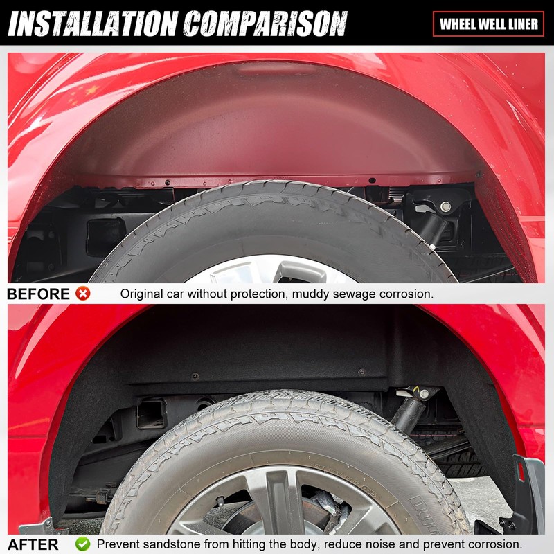 - Noise isolation: A layer of sound insulation felt is attached to the surface of Wheel Well Guards, which can absorb noise while protecting your truck, making your driving experience more enjoyable!
