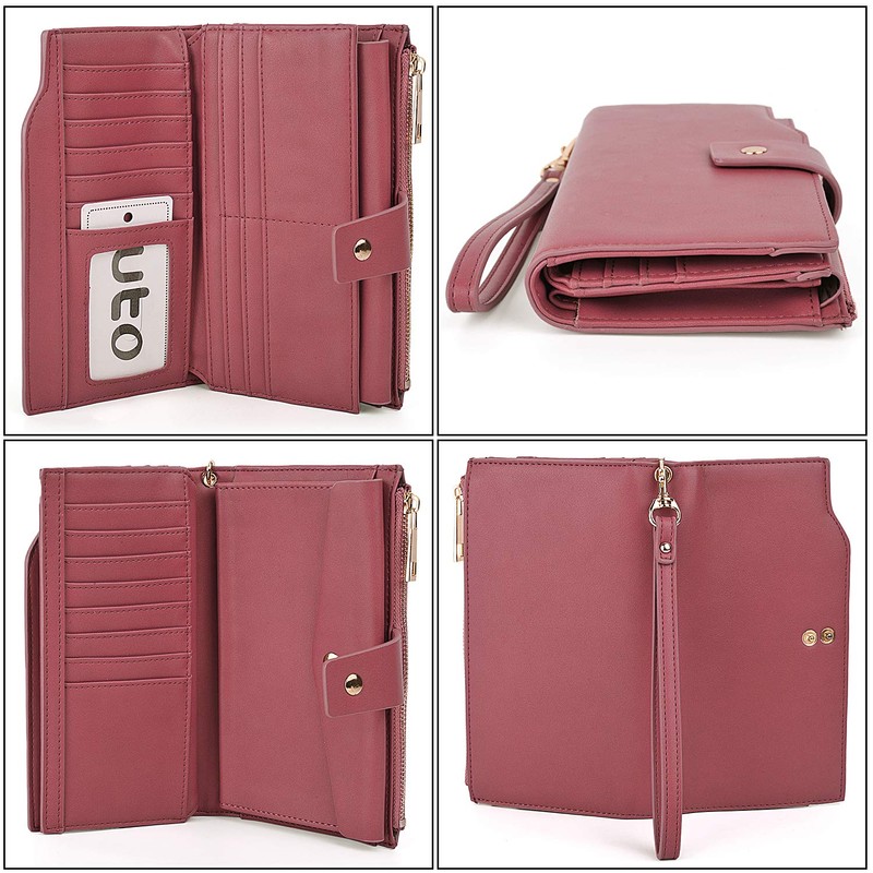 UTO - Cartera Mujer Dama Bloqueo Cuero Monedero Largo RFID 21 Ranuras para Tarjetas Bolsillo para Móvil con Muñequera