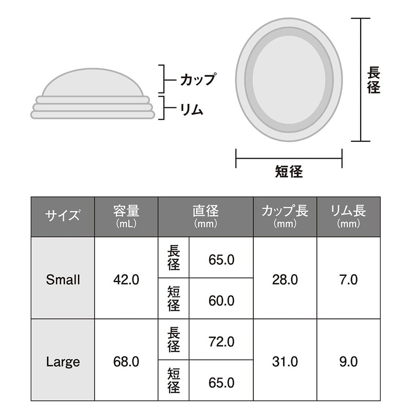 月経ディスクは、月経カップより外径が大きく経血を溜める量も2倍近く多いです。より長時間装着でき違和感も少なく感じられます。