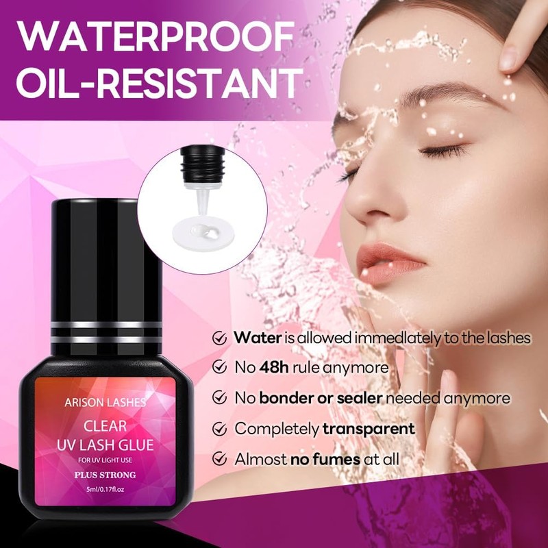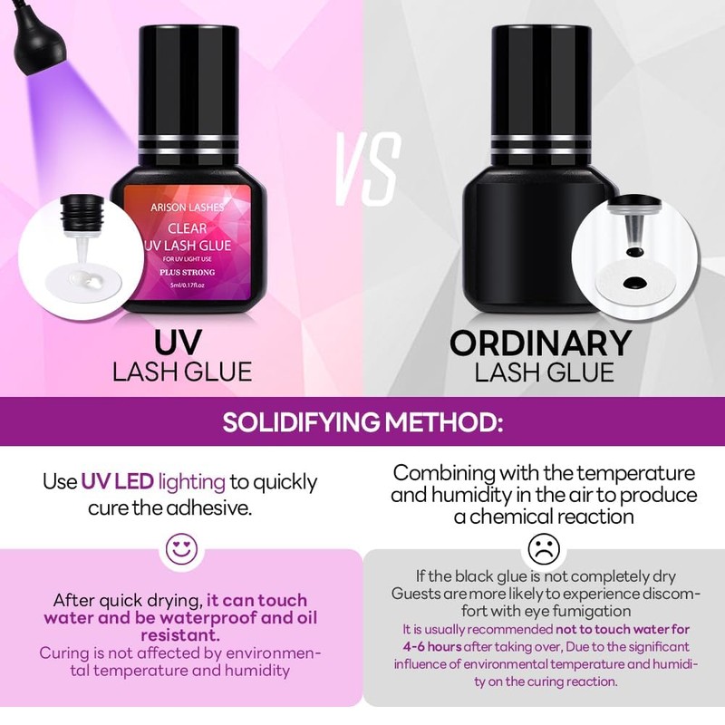 - Advanced UV Curing: Experience the future of lash bonding with our UV-cured formula. UV Eyelash Glue Super Fast with only 1 second drying time – exclusively for eyelash extensions with UV light.With a quick exposure to ultraviolet light, our adhesive transforms into an unbreakable bond that ensures your lash extensions stay in place for weeks.