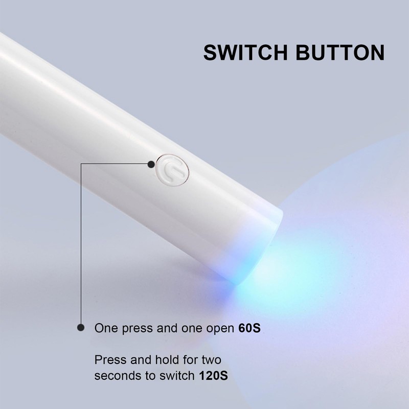 - When using, simply point to the part that is to be dried. This UV lamp has two time modes. The short printing time is 60 seconds, the long printing time is 120 seconds.