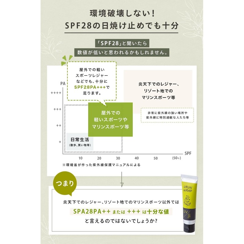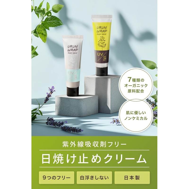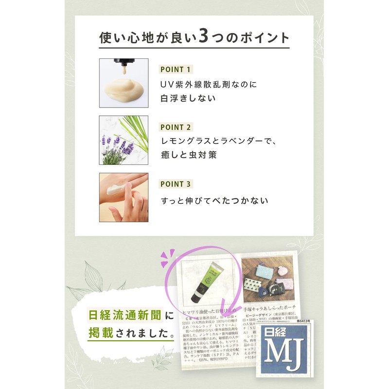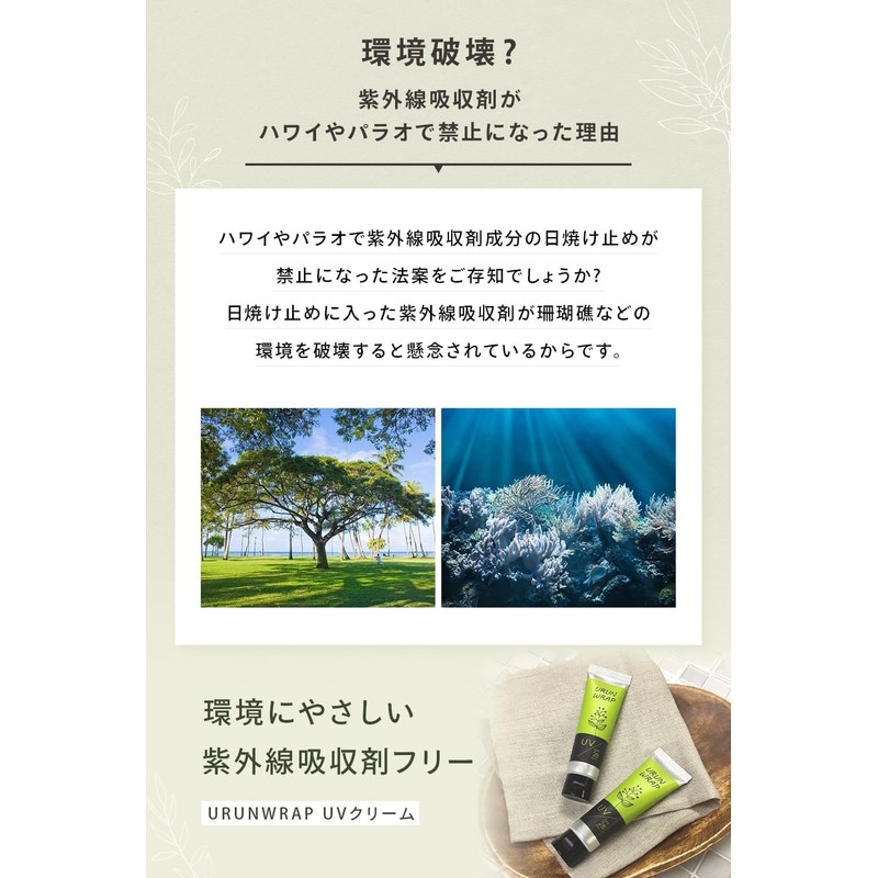 【ノンケミカル 紫外線吸収剤フリー】肌への負担が少ない紫外線散乱剤を採用。環境を破壊するとハワイやパラオで禁止となった紫外線吸収剤不使用。 【9つのフリーで赤ちゃんにも】紫外線吸収剤以外もパラベン、合成着色料、合成香料、シリコン、鉱物油、アルコール、合成保存料、ナノフリーです。 【7種のオーガニック認証原料配合(ECOCERT認証)】 ヒマワリ種子油、ヤシ油、ホホバ種子油、オレンジ果皮油、レモングラス葉油、ニオイテンジクアオイ油、ラベンダー油のオーガニック成分を配合。 【白浮きしない】紫外線散乱剤は「白い無機粉末」となるため、UV製品が白浮きして見えますが、ウルンラップUVクリームは白浮きしなくて、化粧下地としても◎「水溶性の紫外線錯乱剤(酸化セリウム)」で作った日焼け止めクリームです。 【ブルーライトなどの人工光にも着目】スマホのブルーライトによる人工光にも着目。普段使いで使用するUVクリームとして便利です。 【レモングラス配合日焼け止め】レモングラス配合により虫が嫌う香り配合。おすすめです。癒やされる香りを配合しています。