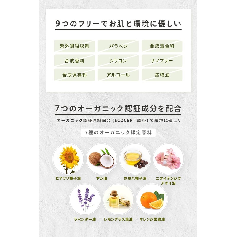 • 【レモングラスの香り&オーガニック成分配合】 レモングラスの香りでリフレッシュ。ECOCERT認証のオーガニック原料7種を贅沢に配合。紫外線吸収剤フリー・合成香料不使用で、自然派志向の方にもおすすめ。 📢無香料タイプも登場!香りが苦手な方にも使いやすい。