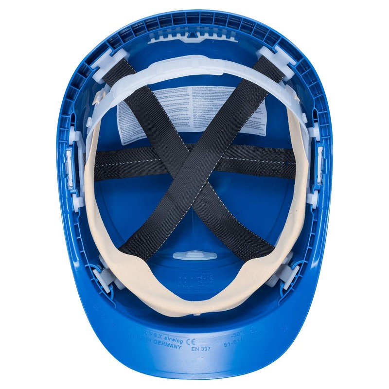 - Construction helmet with long peak for optimal protection (also from sunlight) and 6-point textile suspension
