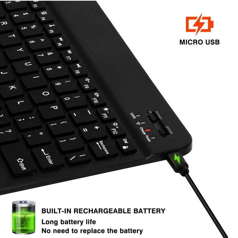 - ECO-FRIENDLY TECHNOLOGY & RECHARGEABLE BATTERIES — The Bluetooth keyboard has a remarkably long-lasting rechargeable battery inside that allows for up to 90 hours of nonstop typing on a single charge. It has an energy-saving mode for environmental conservation that puts the keyboard to sleep after 30 minutes of inactivity to reduce wasteful energy use.