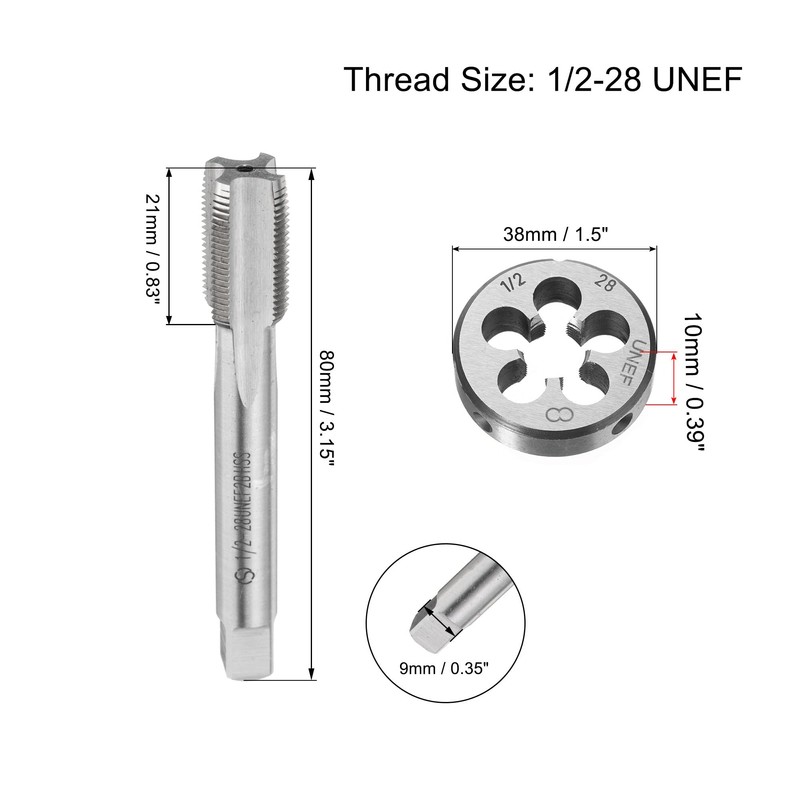 - Tap and Die Set: 1/2-28 UNEF thread tap and round die. 38mm (1-1/2") die stock fits M12-M14 metric dies capacity, with adjustable screws. Suitable for making or repairing male and female threads. Good for general purpose applications.