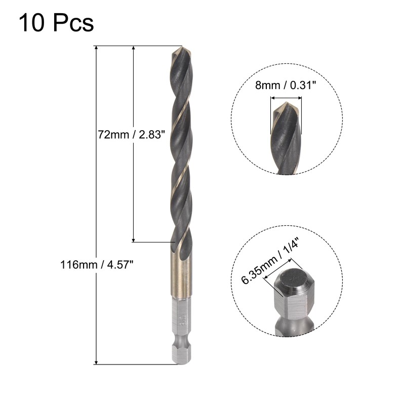- Specification: Shank: 1/4-inch Hex; Drill Diameter: 8mm / 0.31-inch; Total Length: 116mm / 4.57-inch; Drill Bit Length: 72mm / 2.83-inch; 10 x Twist Drill Bits
