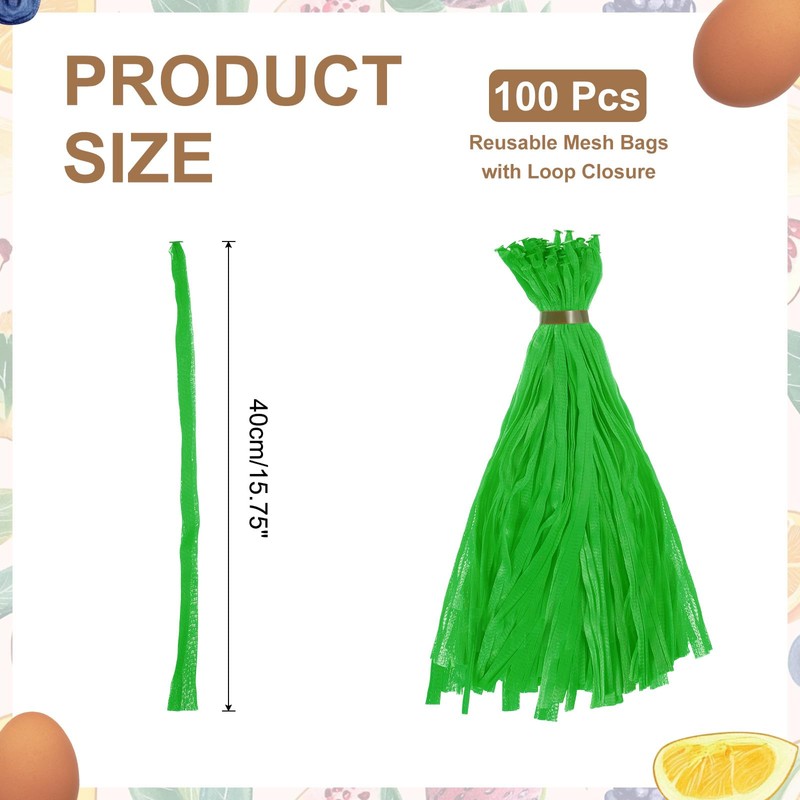 Size&Package: Material: Nylon; Color: Green; Reusable Mesh Bag Length: 40cm/15.75 inch; Package: 100Pcs x Reusable Mesh Bags with Loop Closure