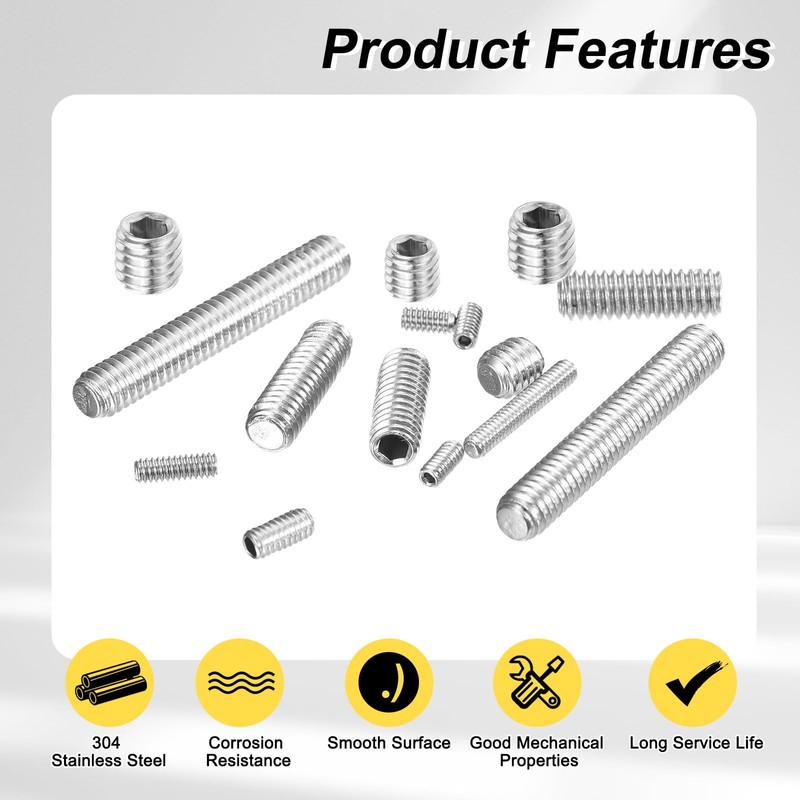 - Material: Socket head grub screws are made of 304 stainless steel, which has excellent corrosion resistance and anti-oxidation properties, good mechanical properties, strong vibration resistance, and long service life.