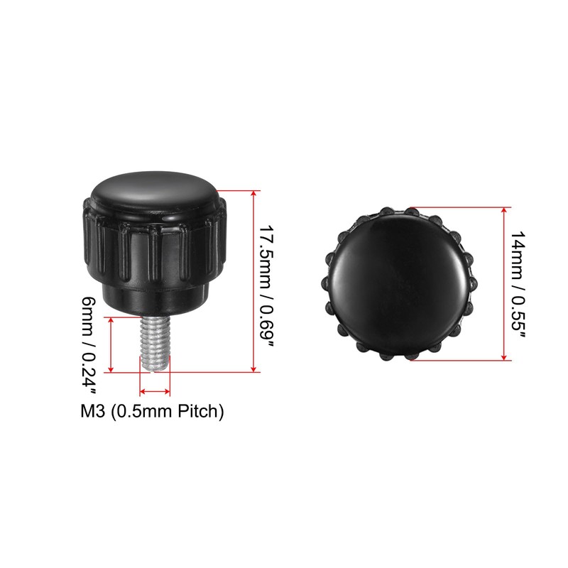 - Standard Thread Size: M3 (0.5mm Pitch); Thread Length: 6mm / 0.24"; Knurled Head Diameter: 14mm / 0.55"; Total Height: 17.5mm / 0.69". The screws are neat and clear, the force is even, and it is not easy to slip.