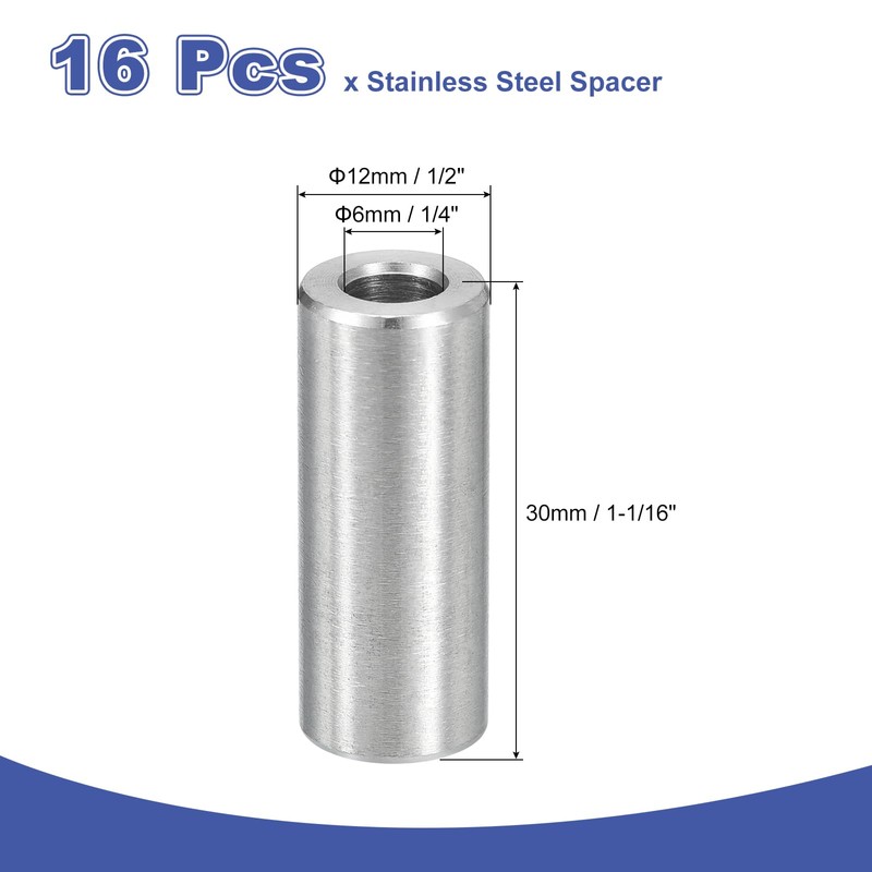 - [Size]: The type of 304 stainless steel spacer is straight, the color is silver, the inner diameter is 6 mm / 1/4 Inch, the outer diameter is 12 mm / 1/2 Inch, the length is 30 mm / 1-1/16 Inch and the accuracy is ±0.2. The package contains 16pcs spacers