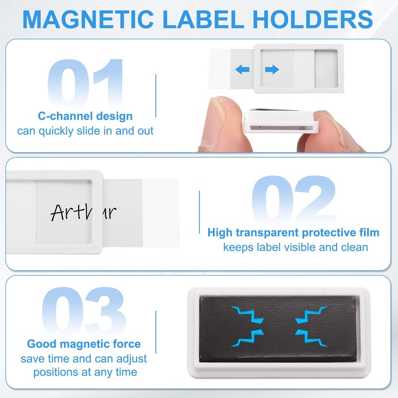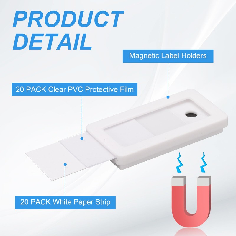 - Easy to use: Write on the included paper strip, slide in the paper insert and clear protective film, and stick the magnetic label holder to a clean, flat surface, save time and make it easier to reposition than traditional adhesive labels, no glue or tools required, can be directly adsorbed on the metal frame and adjust the position of the label at any time.