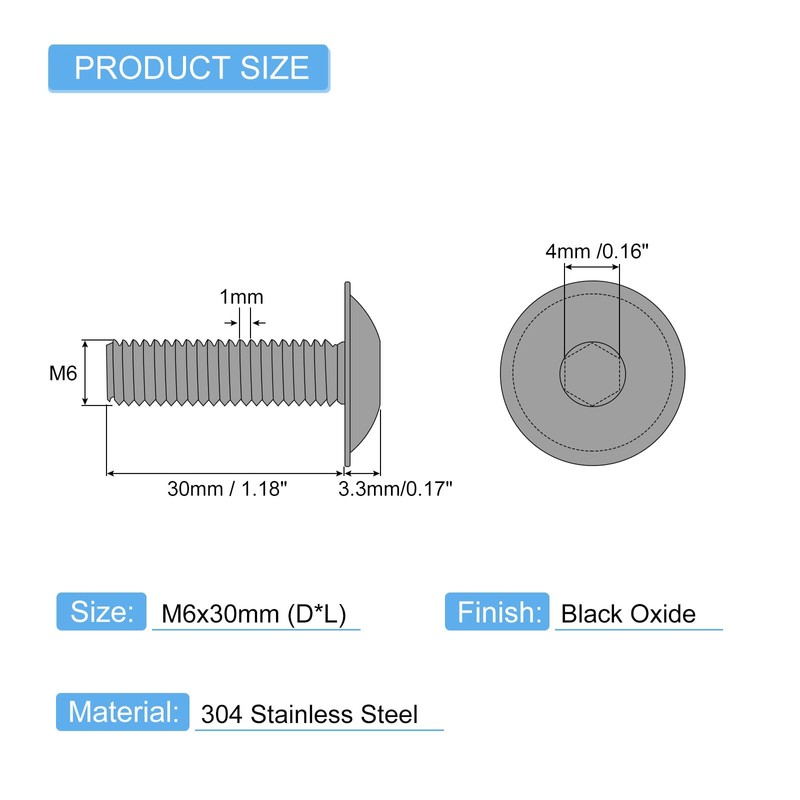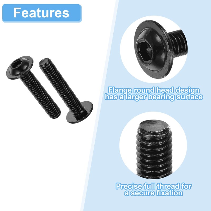 - [SIZE&PACKAGE]: The thread size of the flange round head hexagon socket screw is M6x30mm / M6 x 1.18" (D*L), the pitch is 1mm, the hexagon width is 4mm / 0.16", the total head thickness is 3.3mm/0.13", the flange thickness is 1.2mm/0.05", the head thickness is 2.08mm/0.08". The package content is 25pcs flange round head hexagon socket screws.