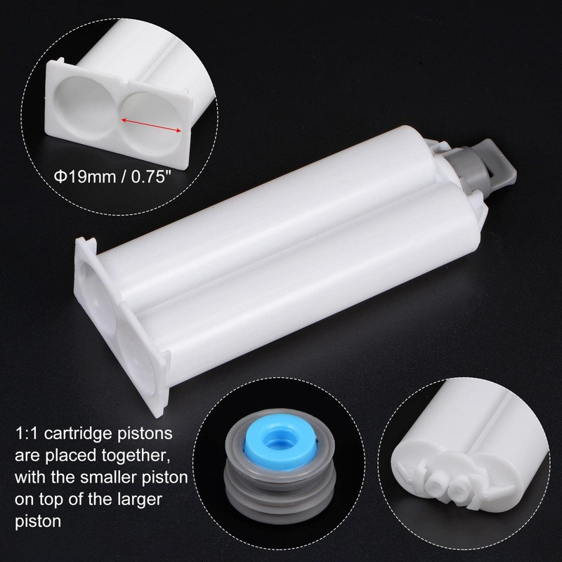 • Specifications: Mixing rates: 1:1, Volume: 50ml, Cartridge Total Size: 45 x 25 x 122mm / 1.77 x 0.98 x 4.8-inch(L*W*H), Push Rod Total Size: 40 x 18 x 97mm / 1.57 x 0.71 x 3.82-inch(L*W*H), Mixing Tube Total Size: 76 x 18.5mm / 2.99 x 0.73-inch(L*D), Hose Inner Diameter: 19mm / 0.75-inch; 2 x Epoxy Gun Adhesive Cartridge, 2 x Push Rod, 2 x Mixing Tube