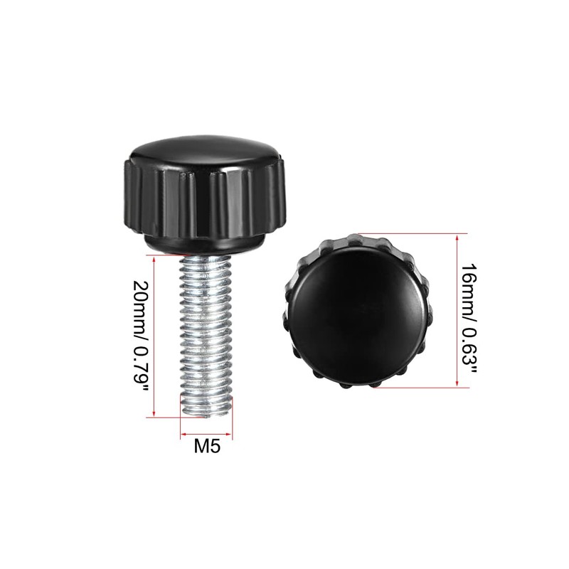 - Standard Thread Size: M5 (0.8mm Pitch); Thread Length: 20mm / 0.79"; Knurled Head Diameter: 16mm / 0.63"; Total Height: 30mm / 1.18". The screws are neat and clear, the force is even, and it is not easy to slip.