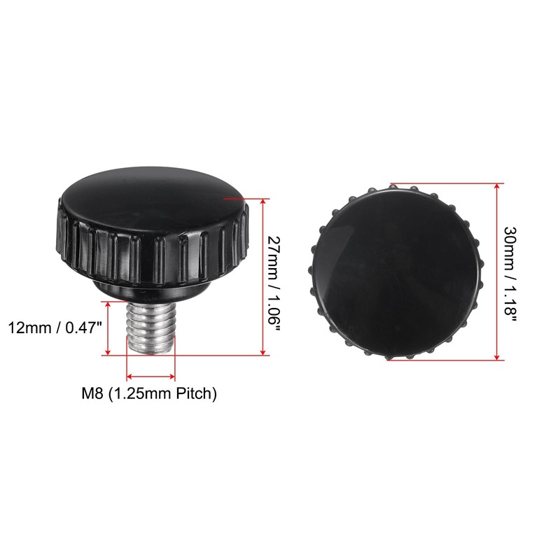 - Standard Thread Size: M8 (1.25mm Pitch); Thread Length: 12mm / 0.47"; Knurled Head Diameter: 30mm / 1.18"; Total Height: 27mm / 1.06". The screws are neat and clear, the force is even, and it is not easy to slip.