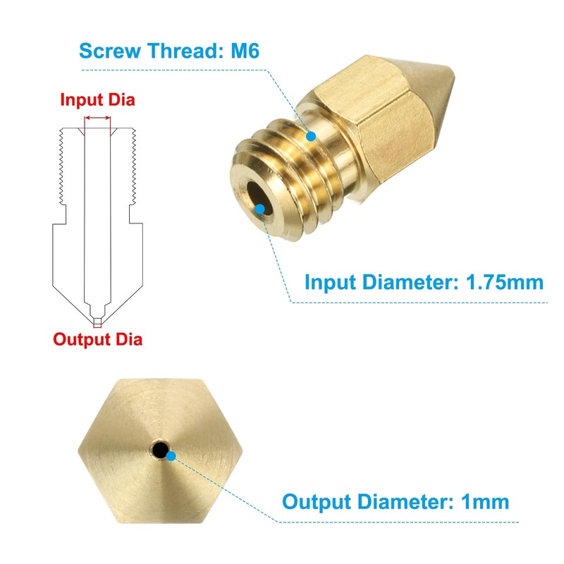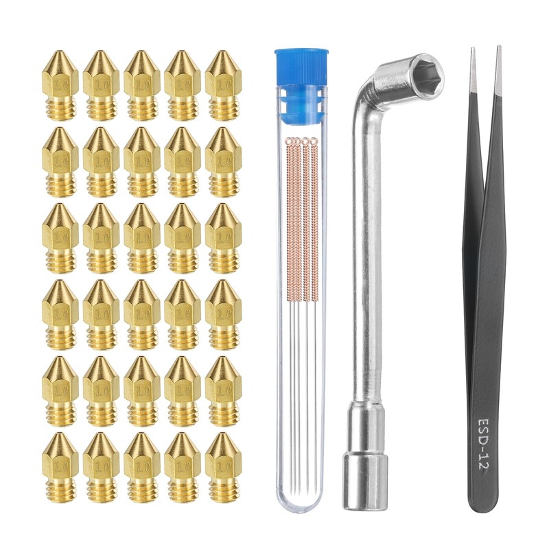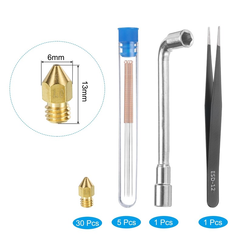 - Package Content: Includes 30pcs 1mm nozzles and 5pcs gold nozzle cleaning needles, come with a socket wrench and a tweezer for convenient use. Input Diameter: 1.75mm. Screw thread: M6.