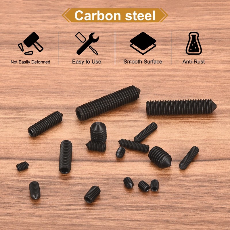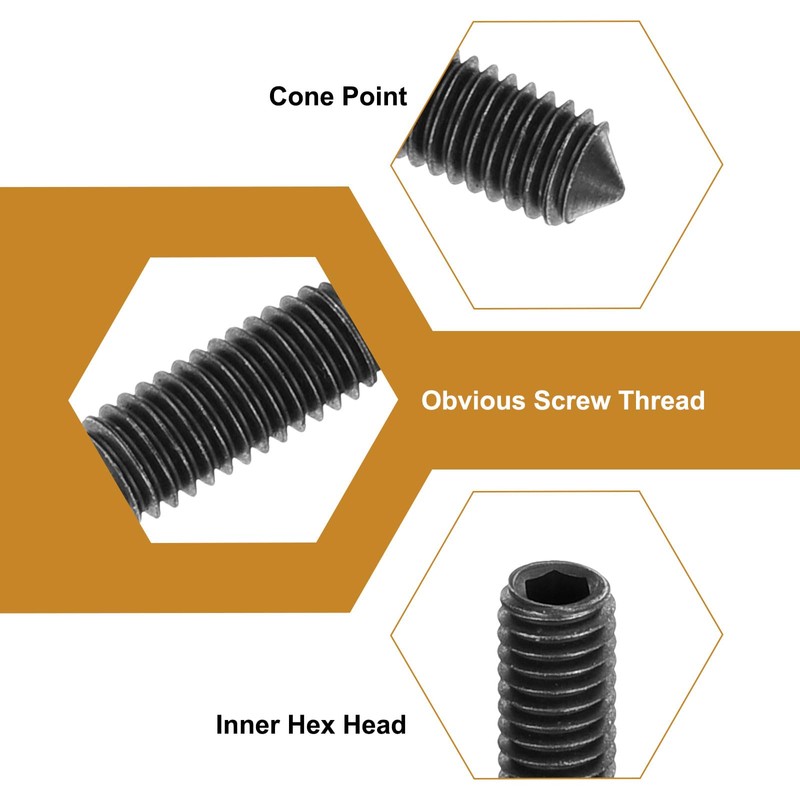 - Widely Applicable: Internal hex screws are versatile, fitting a wide array of applications from home, office, shop, and industrial machinery repairs like door handles, faucets, and light fixtures to precision equipment and electronics. The cone point set screw is particularly handy for minor fixes in furniture, cabinets, and around the house, useful for both professionals and DIY hobbyists