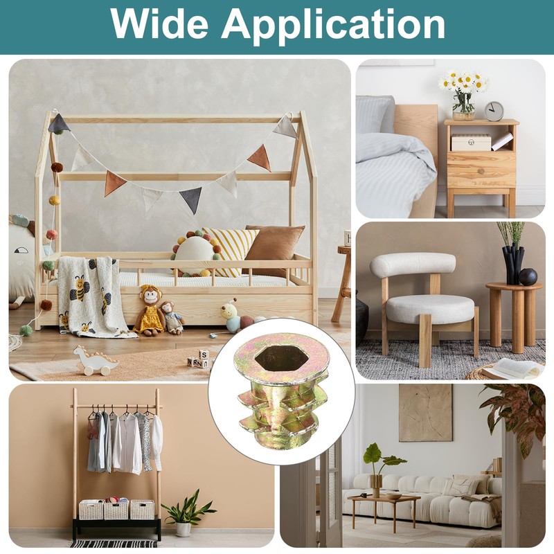 - Wide Application: The nut-threaded inserts can be used to connect and fix various parts. They are important tools for assembling machines, equipment and tools to maintain their structural integrity. Suitable for furniture hardwood, solid wood, pine, plywood, fiberboard, etc.