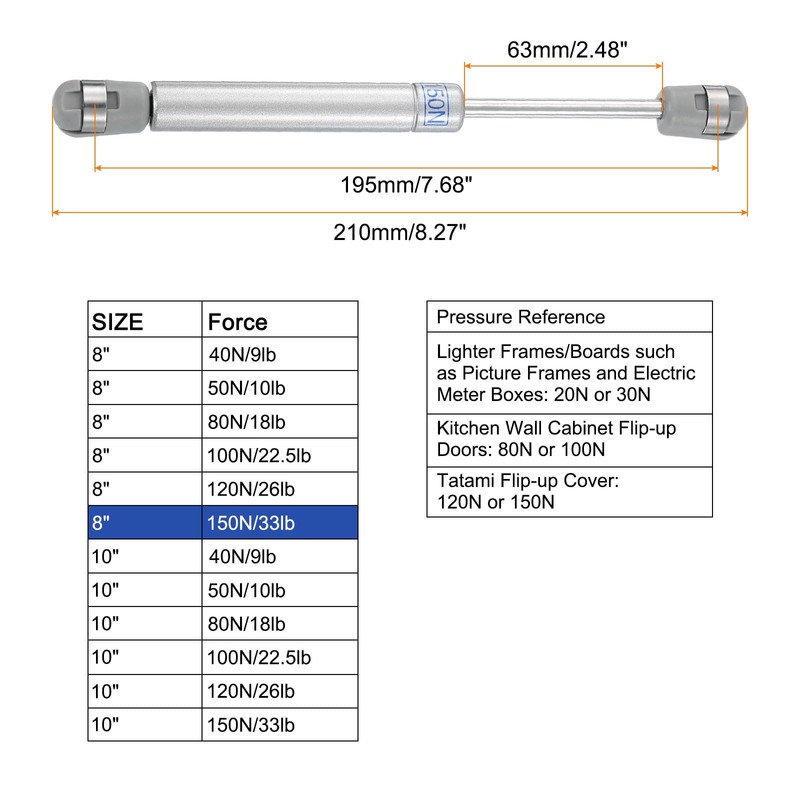 - [Tips] Different load-bearing specifications are suitable for different. 40N/50N is suitable for lighter doors, such as picture frames and electric meter boxes; 80N/100N is suitable for kitchen cabinet doors; 120N/150N is suitable for heavier ones, such as tatami