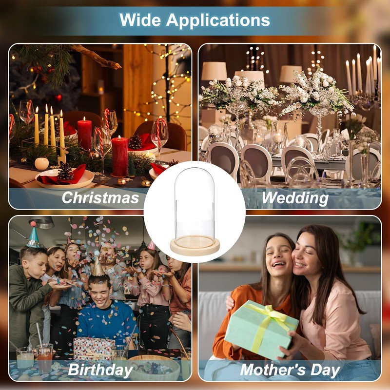 - Application: Glass Cloche Display Dome is designed to showcase and protect delicate items. Suitable for home decor, plant displays, office styling, weddings, and special events. The wooden base adds a rustic charm, making it perfect for centerpieces, terrariums, or displaying collectibles.