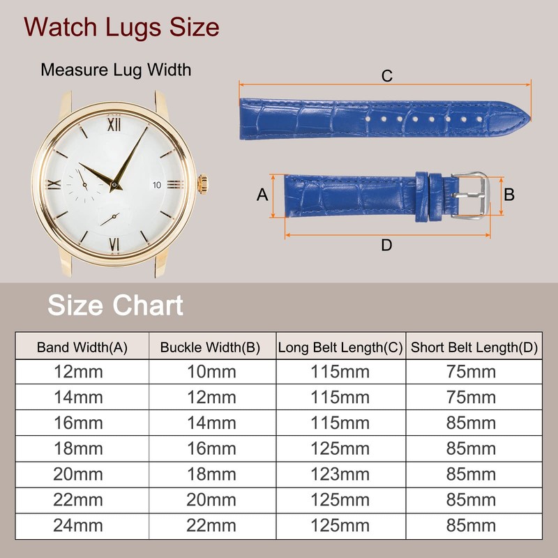 - [ Size ] - This embossed watch strap fits 14mm width watch lugs. The long belt length is 115mm, and the short belt length is 75mm. The width of both ends of the long belt is 12mm and 14mm.