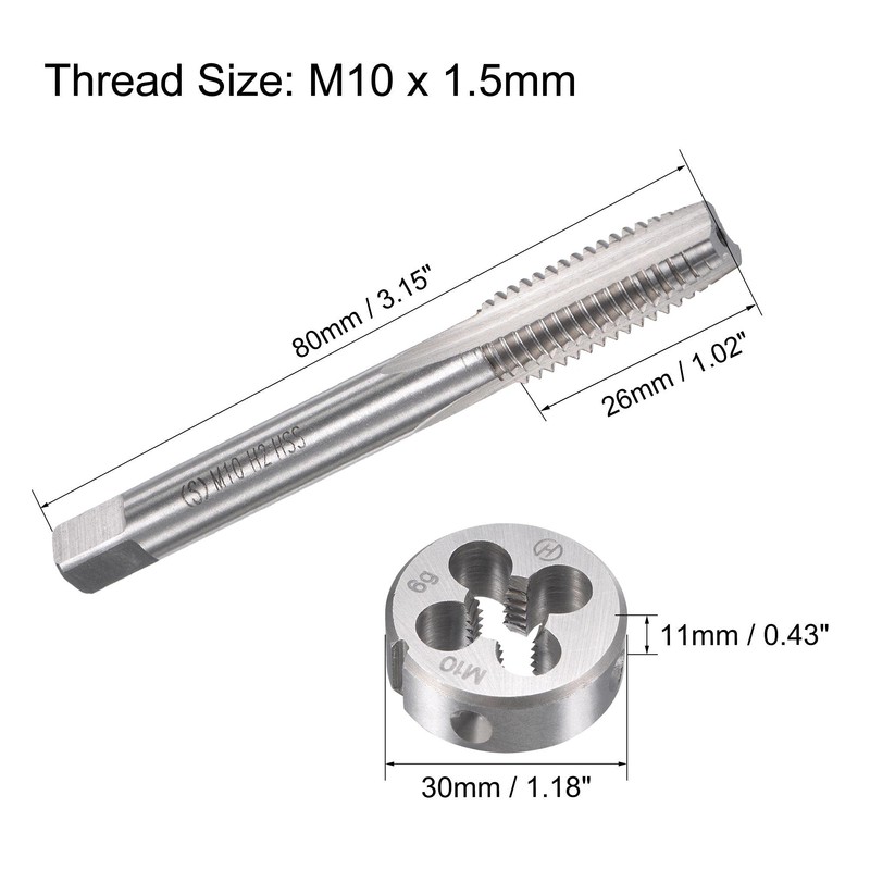 • Tap & Die Set: M10 x 1.5 metric tap and die set can make new threads or re-thread damaged or jammed threads, good for general purpose applications. Clear threads without burrs, right hand tapping direction. Tap Size: thread length: 26mm / 1.02"; overall length: 80mm / 3.15"; square shank: 6mm / 0.24"; Die Size: outside diameter (OD): 30mm / 1.18"; thickness: 11mm / 0.43"