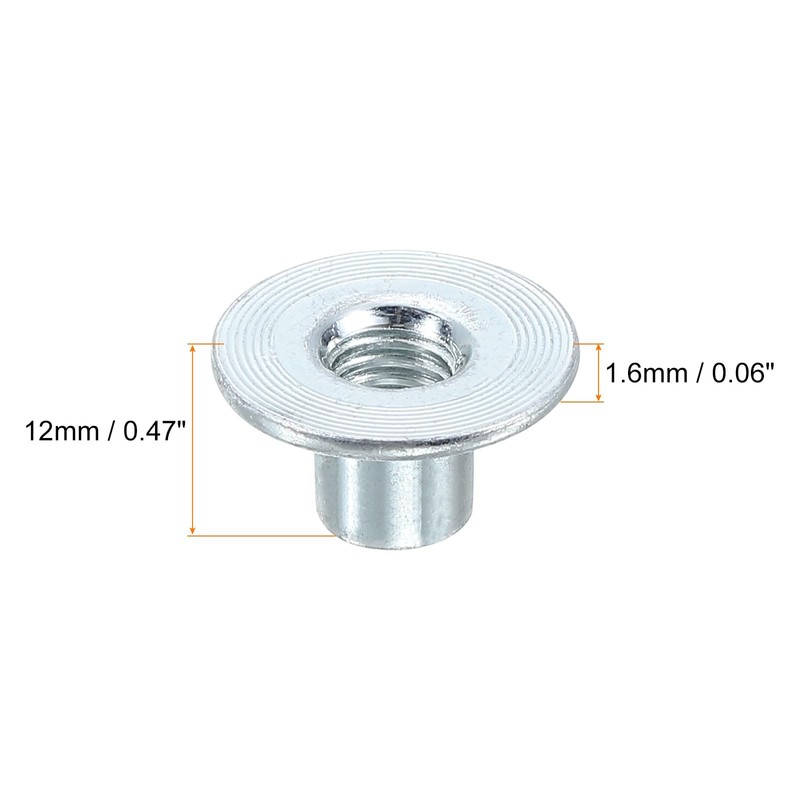 • Female Thread Diameter: M8; Pitch: 1.25mm; Round Base Diameter: 21.7mm / 0.85"; Round Base Thickness: 1.6mm / 0.06"; Total Height: 12mm / 0.47"; Drill Hole Diameter(Rod Diameter of Nut): 9.5mm / 0.37"; Package Content: 24pcs x Tee Nuts
