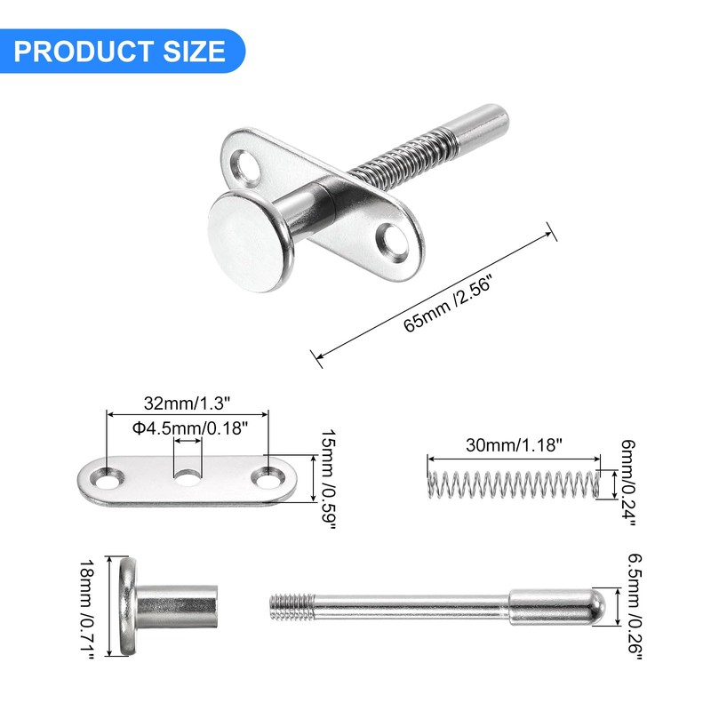 • [What You Get] - Package content comes with 8pcs plunger latches and 16pcs screws. 6.5 x 65mm/0.26 x 2.56inch(D*L) in overall size; Rod Head Diameter: 18mm/0.71inch; Spring Length: 30mm/1.18inch.