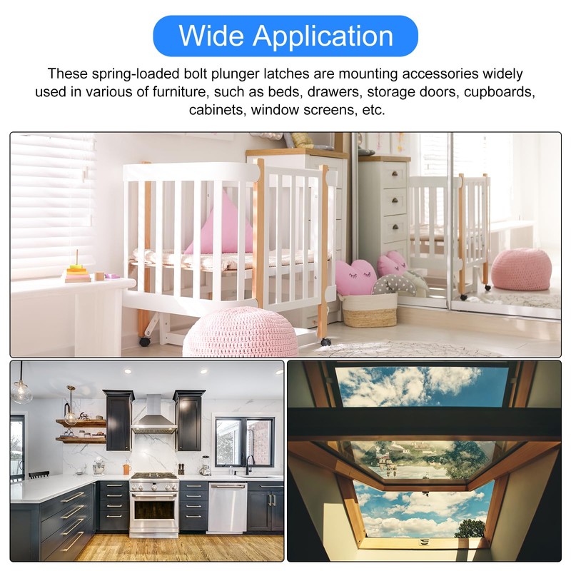 - [Wide Application] - These spring-loaded bolt plunger latches are mounting accessories widely used in various of furniture, such as beds, drawers, storage doors, cupboards, cabinets, window screens, etc.
