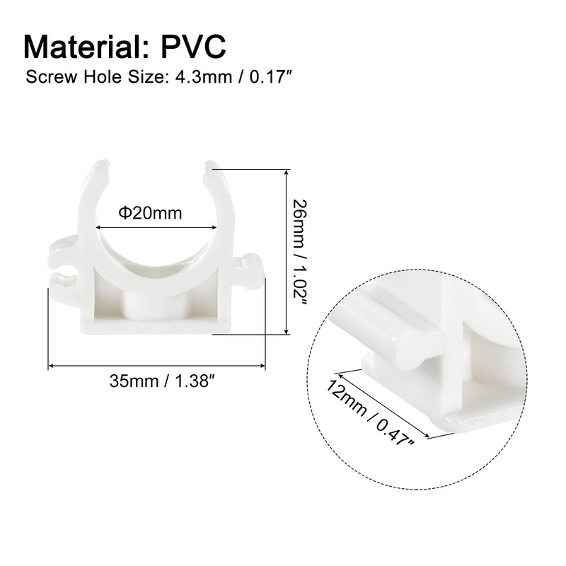 - Fit Pipe OD: 20mm / 0.79"; Overall Size: 35 x 12 x 26mm / 1.38" x 0.47" x 1.02"(L*W*H); Screw Hole Size: 4.3mm / 0.17"; Package Content: 50pcs x U-Shaped PVC Water Pipe Clamps(Not including mounting screws)