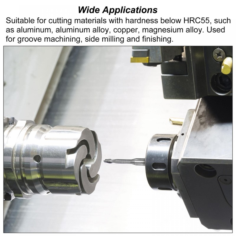 - Wide Applications: Suitable for cutting materials with hardness below HRC55, such as aluminum, aluminum alloy, copper, magnesium alloy. The end mill has an extended neck (long reach) that provides additional reach and clearance for machining deep or hard-to-reach areas.