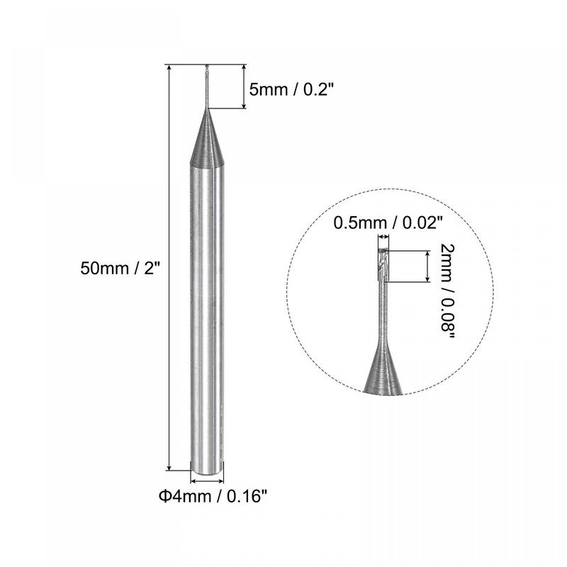 - End Mill: Cutting Diameter: 0.5mm / 0.02"; effective cutting length: 5mm / 0.2"; cutting edge length: 2mm / 0.08"; shank diameter: 4mm / 0.16"; overall length: 50mm / 2"; cutting hardness: HRC55. Used for groove machining, side milling and finishing.