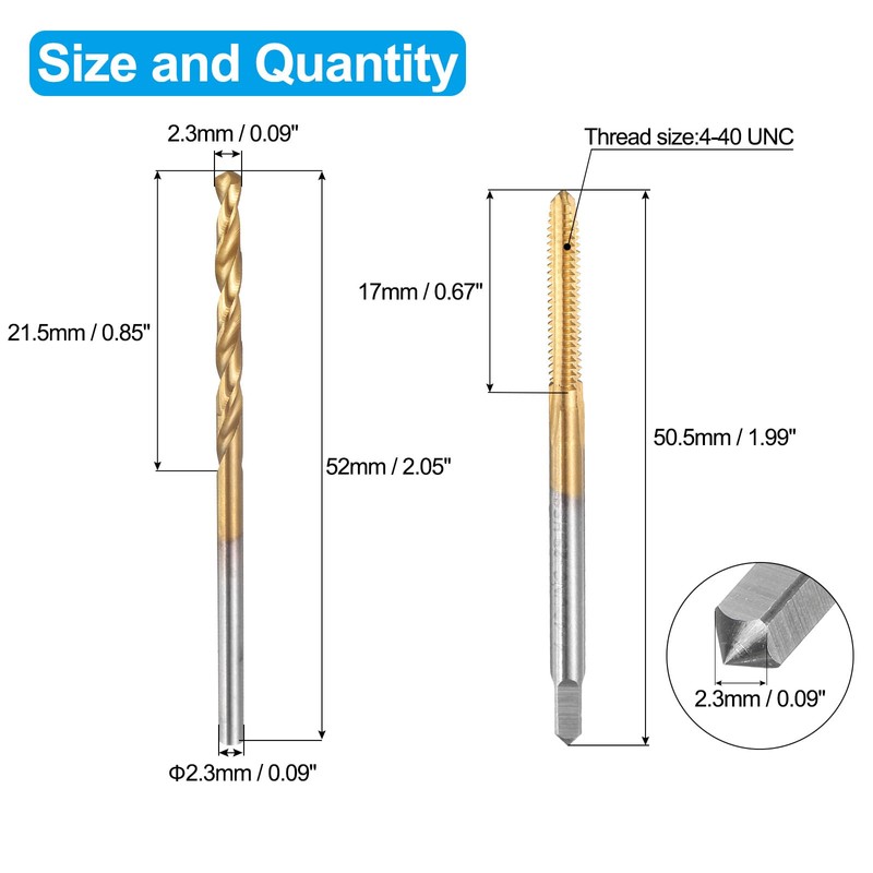 - Tap and Drill Bit Set: 1pcs 4-40 UNC (right hand) thread taps and 1pcs 2.3mm (right hand) drill bit. 6542 (M2) high speed steel screw tap & drill bit set offers high hardness, good toughness, excellent wear and heat resistance for durability, and good cutting performance for clean, precise holes.