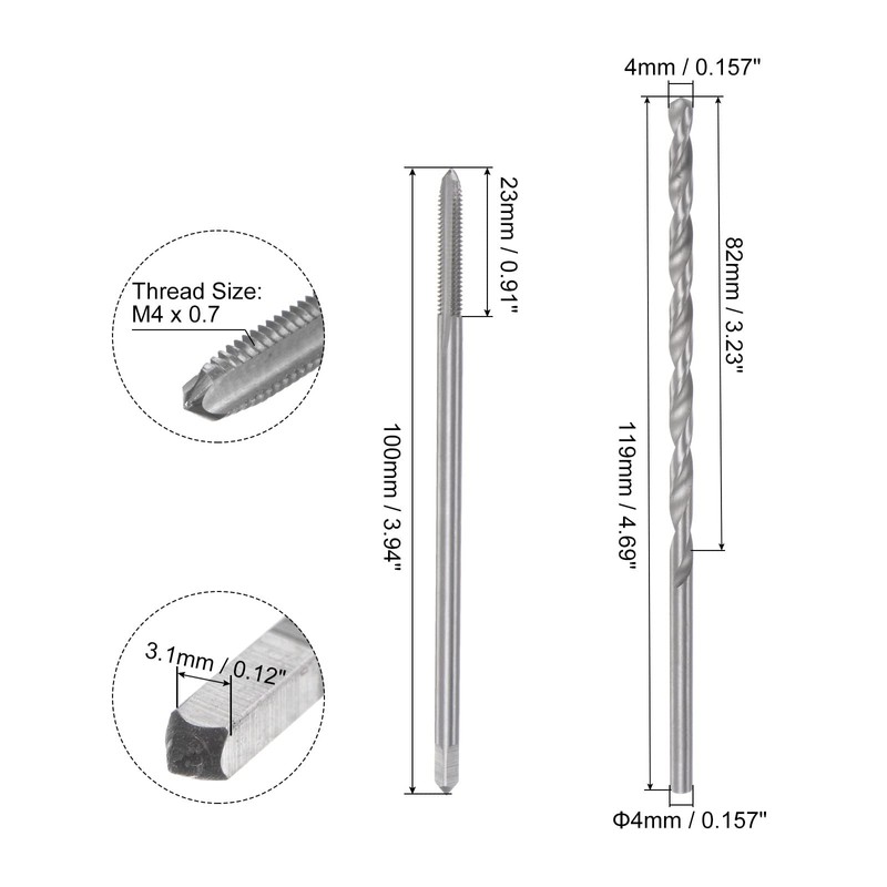 • Tap & Bit Sets: Tap size: thread size: M4 x 0.7; accuracy: H2; total length: 100mm / 3.94". Drill bit size: cutting edge diameter: 4mm / 0.157"; total length: 119mm / 4.69". (Note: In the set, this drill bit is NOT suitable for drilling holes for this tap before threading.)