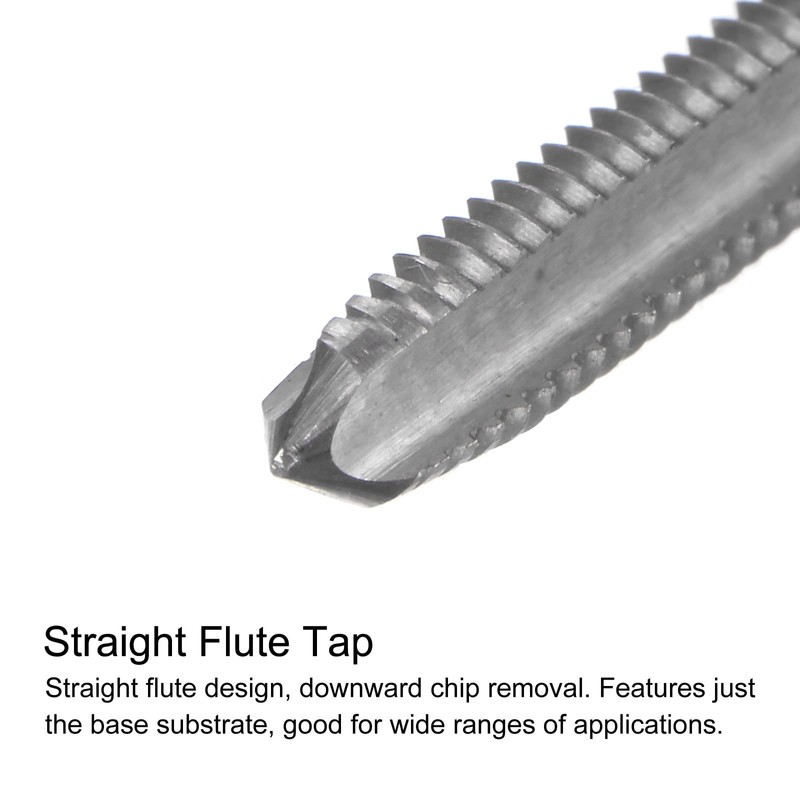 Descriptions: (Note: In the set, this drill bit is NOT suitable for drilling holes for this tap before threading.)Straight flute design, downward chip removal, fast tapping with accuracy. Suitable for processing through holes or shallow holes. For tapping aluminum, die steel, stainless steel, bronze, hard plastics. High-speed steel tool has high hardness and toughness for wear resistance. Features just the base substrate without any additional coatings, good for wide ranges of applications. Used on drilling machines, tapping machines, CNC and milling machines. Use with tapping oil to get higher quality threads and more durable taps. Machine taps are suggested to be used with tap collets with overload protection. Hand use is easy to cause breakage to the tap due to uneven force.