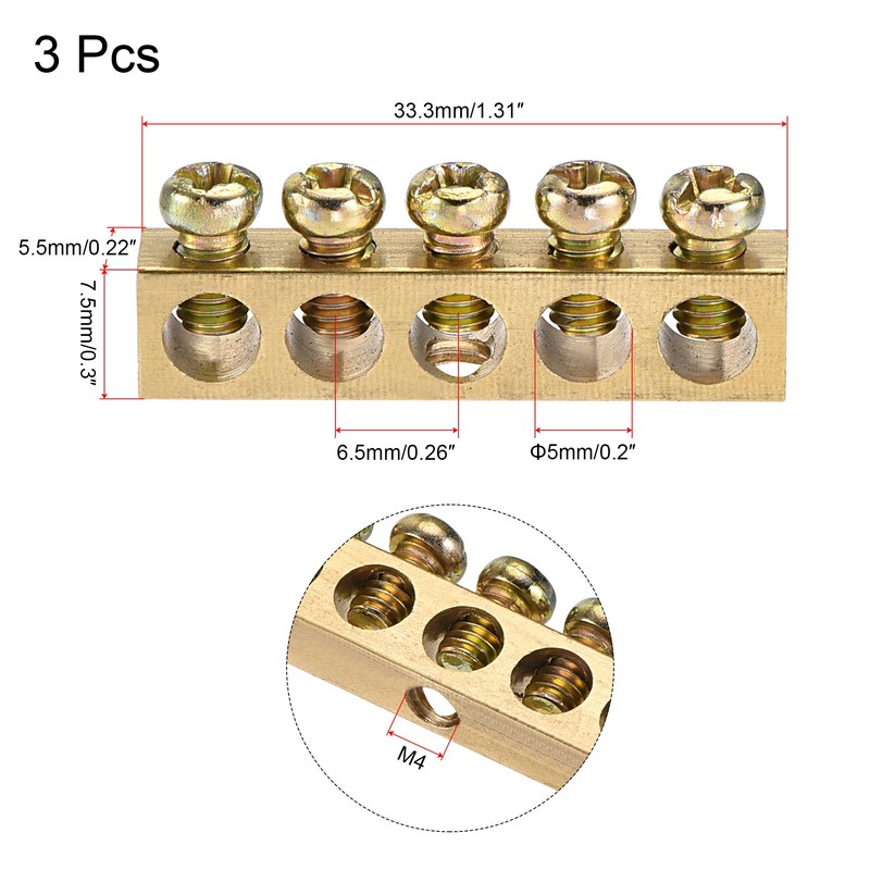 Terminal Ground Bar Specifications: Type: 5 Positions. Hole Diameter: 5mm Hole Distance: 6.5mm Overall Size: 33.3 mm x 5.5 mm x 7.5 mm (L*W*H); Thread Size: M4*0.7; Mounting Hole Size: M4
