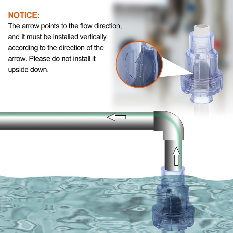 - [Easy to Install] - This ball check valve needs to be installed vertically, make sure it is installed in the upstream position to work properly. There is an arrow mark direction on the valve body, and the arrow points to the flow direction. Please do not install it upside down.