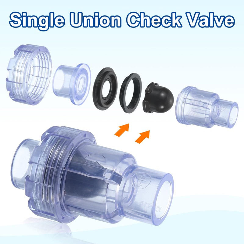 - [Anti-backflow & Anti-leakage] - The union check valve, the valve body is designed with a round ball inside, which allows one-way flow and closes to prevent backflow. There is a gasket and O-ring to provide excellent sealing to prevent leakage.