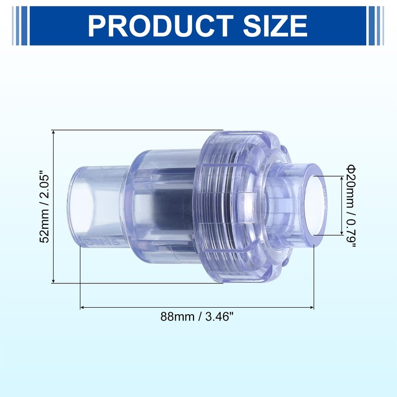 - [What You Get] - Package content comes with 1 piece of UPVC plastic ball union check valve fit for 1/2" OD pipe, with 20mm/0.79inch inner diameter, 88 x 52mm/3.46 x 2.05inch (L*W) in overall size.