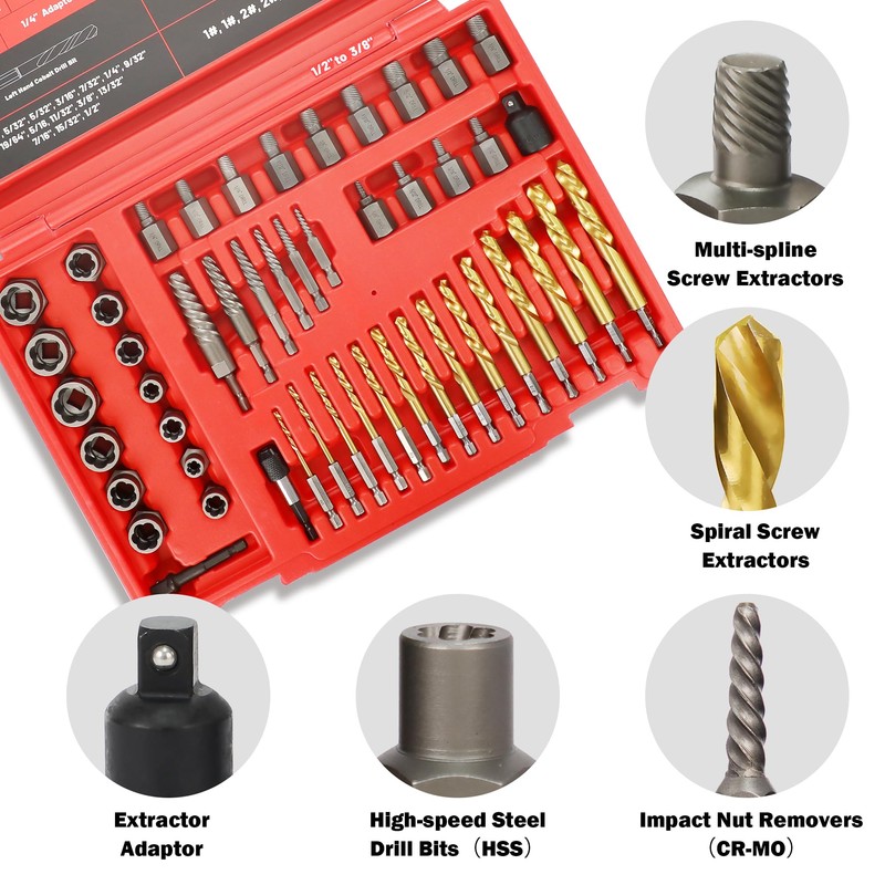 - ★Multi-size Sets: 49+4 Pieces set, include multi-spline extractors, spiral screw extractors, left hand cobalt drill bits, nut removers, extractor extension. Suitable for most job applications.