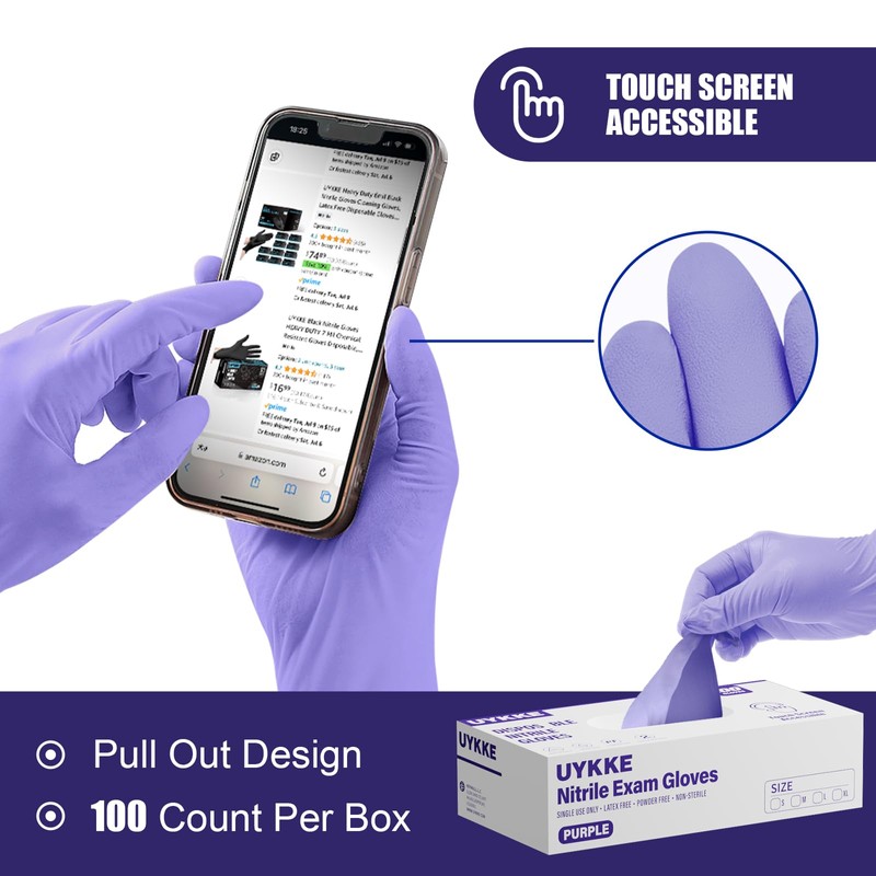 - 【100% Nitrile Gloves】UYKKE purple disposable gloves are made with highly stretchable nitrile material for superior puncture resistance. Also designed with a rolled cuff for easy on and off. Coming in a convenient dispenser box that keeps the gloves organized and clean, while also providing easy access.