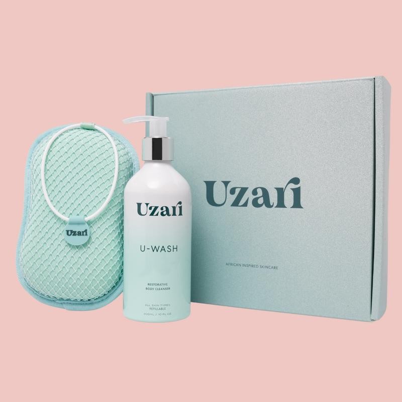 Transform your body care ritual with Uzari's comprehensive Glow Set, featuring a 10oz restorative body cleanser, innovative exfoliating sponge, and convenient travel bag. The U-Wash Cleanser harnesses African tradition, blending unrefined shea butter, coconut oil, cocoa pods, and vitamins A and E to balance moisture, boost collagen production, and promote healed, brighter, calmer skin. The uniquely-designed U-Scrub Exfoliator — an antibacterial, quick-drying mesh that can last up to 12 months — promotes blood circulation and effectively unclogs pores while enhancing product lather and reducing soap usage. This dynamic duo works in harmony to support cellular reconstruction, restore the skin barrier, and fight signs of aging, transforming daily cleansing into a luxurious ritual of renewal. Perfect for travel or gifting, this set offers a complete body transformation experience that honors ancient beauty traditions while delivering modern results.