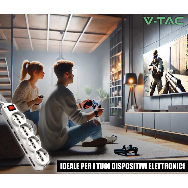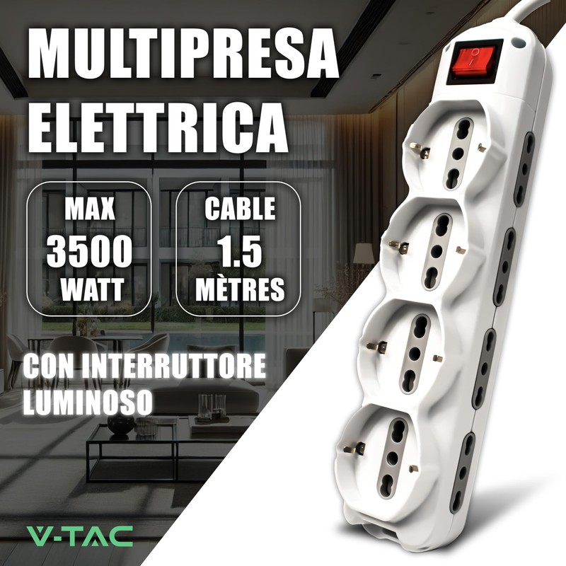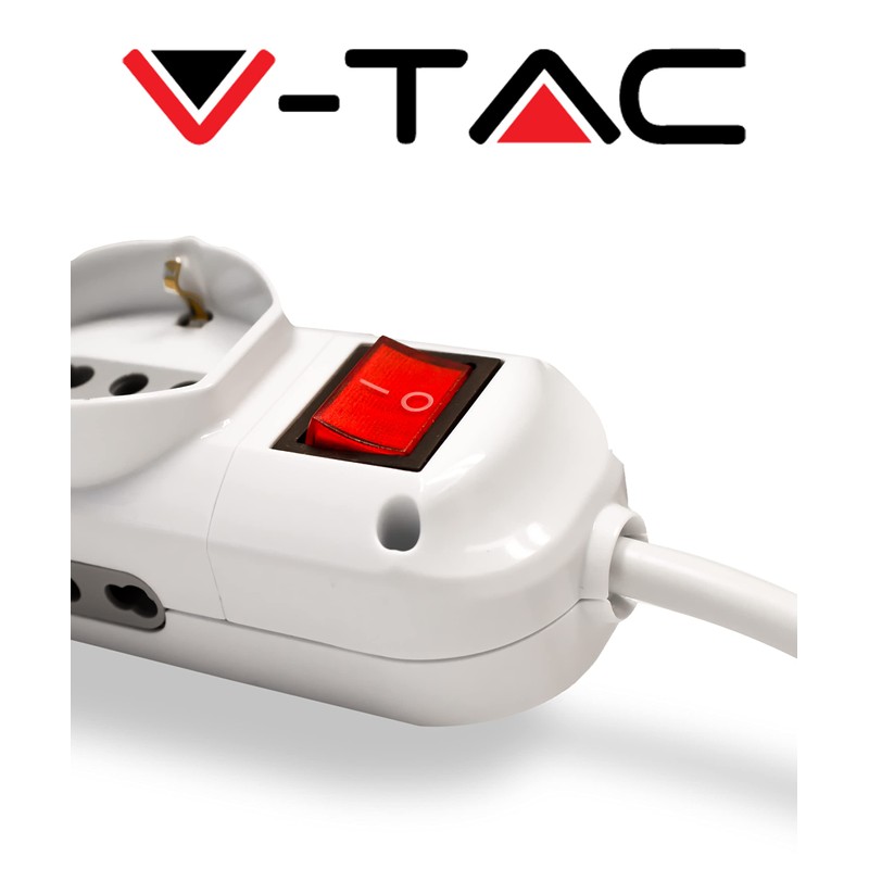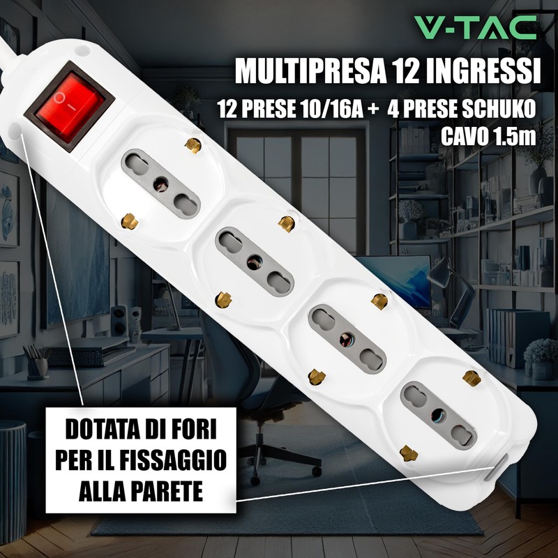 V-TAC Power Strip with Switch and Cable 1.5m - 8 Side Sockets 10/16A and 4 Fronts 10/16A Bipasso Shuko - Electric Socket for Home, Office, Store - Plug 16A