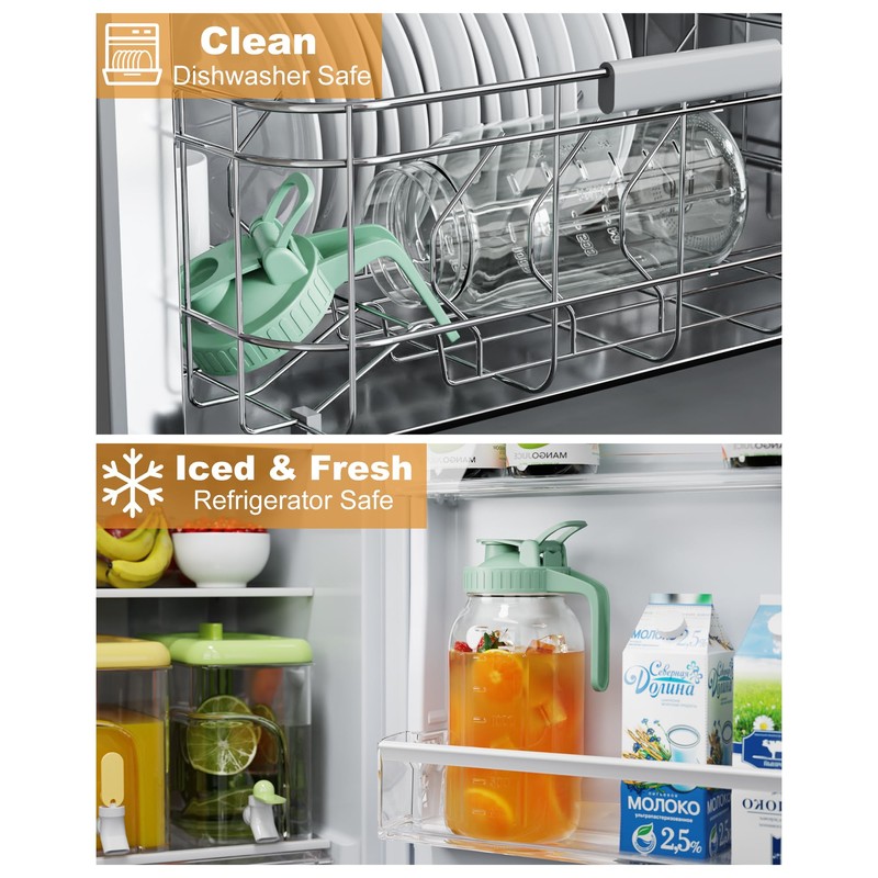- Premium Quality Glass Jug - This glass water pitcher is made of great quality food grade glass,the sturdy glass material is not easy to break.The glass jar and lid are free of lead,cadmium and BPA and have no unpleasant odor to affect the taste of your drink.Can be stored in the refrigerator and can be washed in the dishwasher