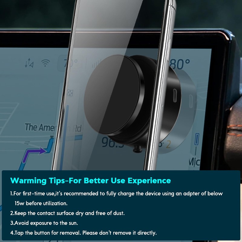 - 🚗 WARMING TIPS: 1. When using this magnetic suction phone mount for the first time, please use an adapter below 15W to charge the device fully. 2. Ensure that the space between the suction phone mount and the contact surface is dry and dust-free to avoid effecting the adsorption effect.