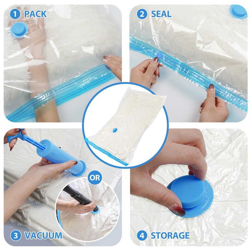 - Smart Space Solution: Easily compress bulky items using any standard vacuum cleaner or the included portable hand pump – no electricity needed. Perfect for travel: compress clothes to avoid airline weight limits and reduce wrinkles, ensuring outfits are ready to wear upon arrival. The airtight seal protects against dust, moisture, and odors to keep belongings fresh.