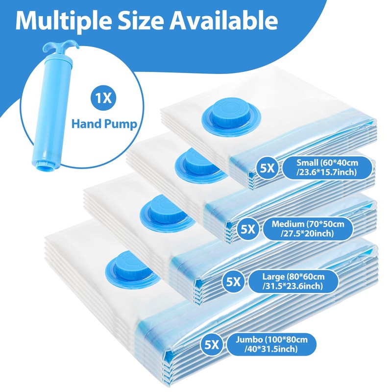 - Various Sizes Available: Includes 4 sizes: 5 x Jumbo (39.4" x 31.5"), 5 x Large (31.5" x 23.6"), 5 x Medium (27.6" x 19.7"), 5 x Small (23.6" x 15.7") + 1 hand pump. The diverse sizes are suitable for storing a wide range of items, from large comforters and seasonal clothing to small accessories and delicate garments, providing flexible fitting for any need.